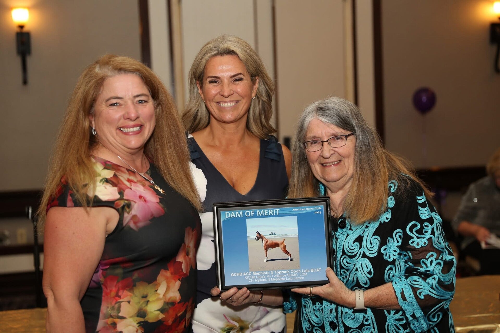 Bridgette Brown, President of the American Boxer Club, presents Michelle and Cheryl with Lala's Dam of Merit plaque at the American Boxer Club Annual Awards Dinner on May 8, 2025 in Indianapolis, Illinois